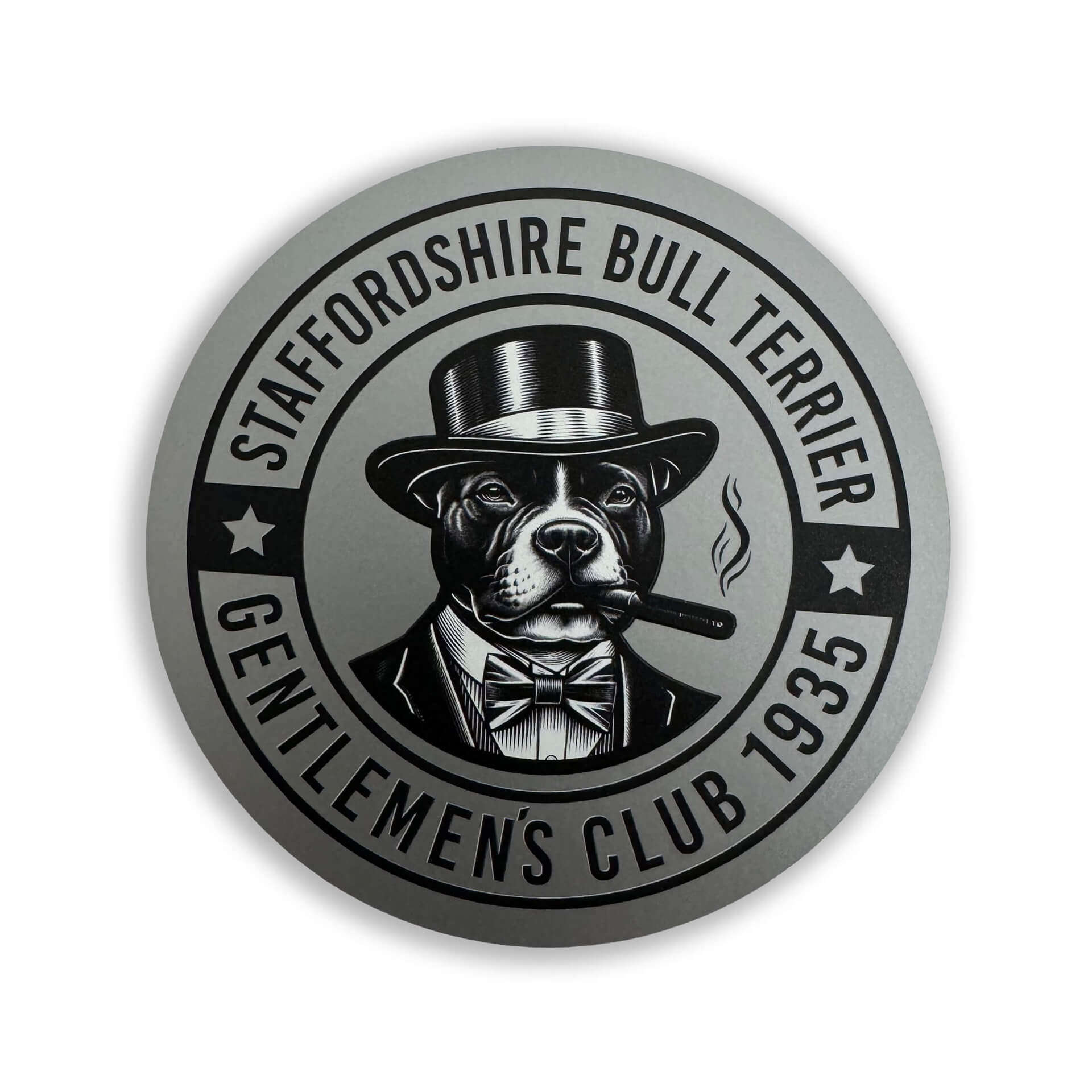 Hochwertiger Staffordshire Bullterrier Aufkleber - Autoaufkleber Motiv „B004“ auf Folie silbermetallic matt. Im UV-Digitaldruck hergestellter Aufkleber für den Außen- & Innenbereich. Mehrere Jahre UV- und wetterbeständig. Das Motiv "Gentlemen´s Club" ist ein Must-have für alle Staffordshire Bullterrier Freunde.
